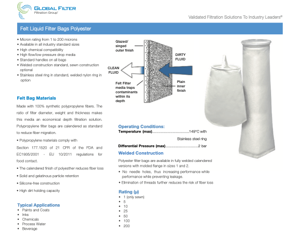 Suitable for both industrial and process uses, our felt and mesh filter bags provide an efficient, cost-effective solution for pre-treatment and post-treatment processes. Filterquip supply Global Filter Bags in the UK and Irish markets to a wide variety of users in various liquid application streams. Notably, our Global Filter Bags are Kosher and Halal Certified, with current certificates available for processes throughout the food industry.